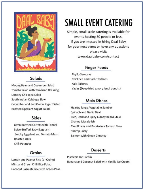 Daal Baby will prepare a delicious spread of food for you and your guests in your home! Services will include menu planning, grocery shopping, cooking and clean-up. Food will be served family style.